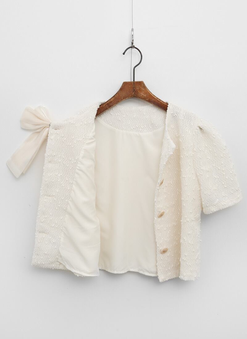 スパンコールリボンジャケットは、華やかなスパンコールが施され、胸元には可愛らしいリボンがアクセントの一着。一枚でおしゃれ感を演出できる半袖ジャケットです。お出かけやパーティーなど、特別な日にぴったりの一着です。