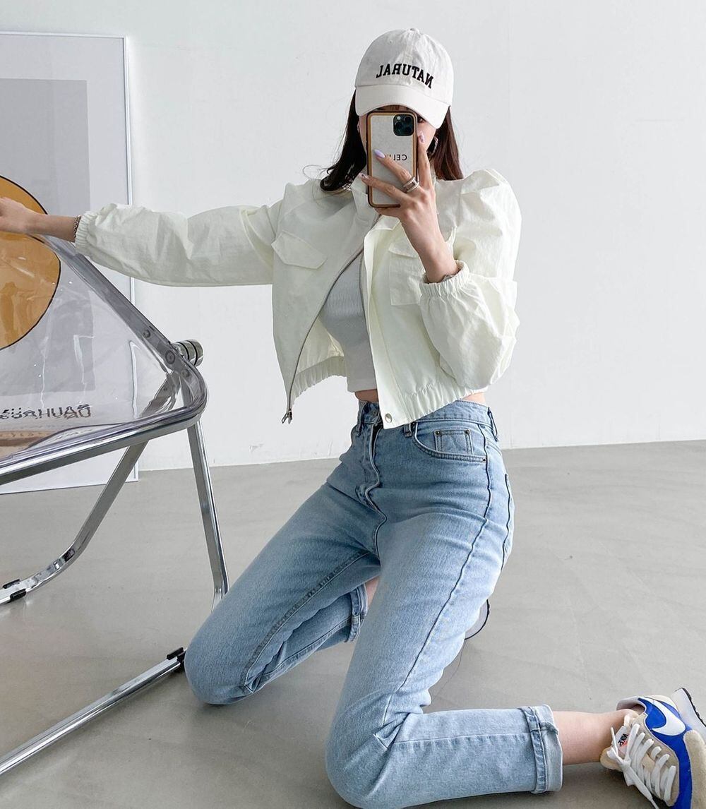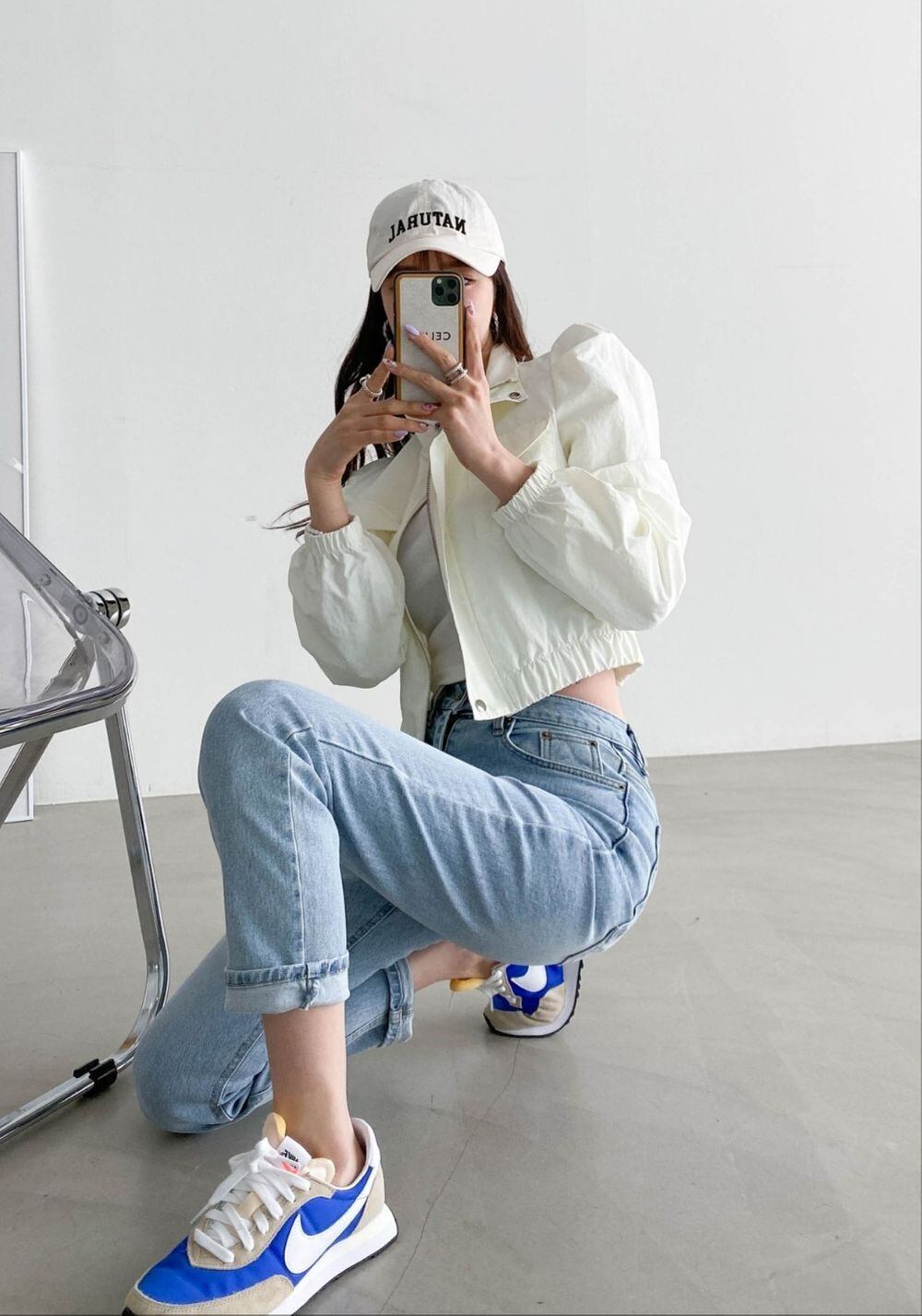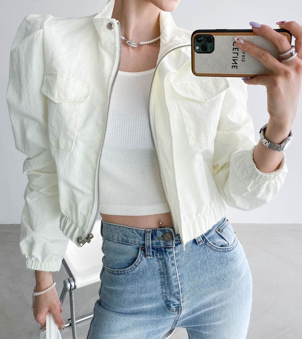 程良いハリ感のあるナイロン素材が特徴のパフショルダージャケット。首元にボタンがデザインされ、かっこよさの中にも女性らしいシルエットを演出してくれます。薄手の生地で軽やかな着心地ながらも、パフスリーブが華やかさをプラス。